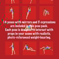 14 photo-referenced poses, with mirror poses, created with realistic weight-bearing in mind. Also included are five photo-referenced expressions to complete your look.
