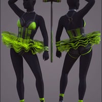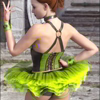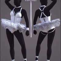 Where performance meets edge, this bold outfit fuses an elegant silhouette with a rebellious heart. Designed for Genesis 9, Barre Sinister blends structured corsetry, strappy details, and layered mesh for a dramatic look that's equal parts grace and grit. Whether on stage, in the spotlight, or commanding your next render, it's a statement of power and poise.