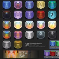 Body of Light loads almost 200 lights directly to Genesis 3 or Genesis 2 figures. The lights are divided up from head to toe and are parented to each major body part. This means the lights move with the figure in any pose and will encompass hair, clothing, accessories, props, and anything close to the figure. There are 31 presets that fit Genesis 3 Male and Genesis 3 Female, 7 for Genesis 2 Male and Genesis 2 Female. For close-up portrait renders, nearly 200 lights are parented to the head only and cast light over the shoulders, back and chest.