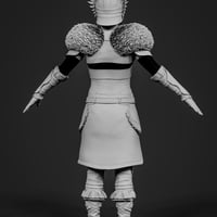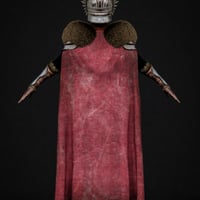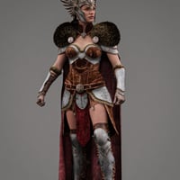 This striking ensemble includes a detailed dress, flowing cloak, rugged gloves, sculpted shoulder armor, helmet, and sturdy boots.