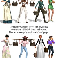 Commoner Co-Star Aiko is a working-woman's pose set featuring the Aiko character. She is hard at work as a Porter, Laborer, Servant, and as a Gossip. Where would the Upper Classes be without the salt of the earth? These are the poses to populate your backgrounds and give them more energy and realism. Who knows? They may steal the show.