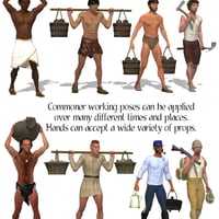 These action poses can also accommodate workers worldwide, in any century. Designed for the Lee body and scaling, these actions can also work with other Genesis 2 figures with slight tweaking.