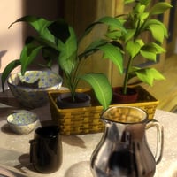 Make your 3D country kitchen a warm and inviting place with these rustic accessories. An aged-wooden hutch is the star of this set, with doors and drawers that open and close. Stock it with the included everyday plates, bowls and glasses. Top off the look with a collection of wall frames, friendly curtains and an understated hanging lamp to tie it all together.