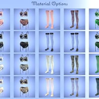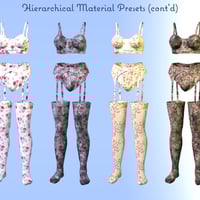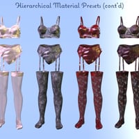 The outfit includes some hierarchical material presets for changing the look of the outfit. It also includes additional material and shader presets for changing parts of the outfit or selected surfaces. The Bra, Garter, Pantie material presets are for use with either the Bras, Garters, or Panties and Stockings material presets are for just the Stockings.
