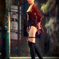 Consisting of a bodysuit, coat, garters, and boots, this outfit is ready for anything you can throw at it.