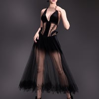 A neck bow and fitting earrings and zipper, as well as the big bows on the sadals are complete this elegant outfit.