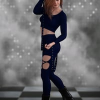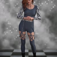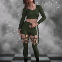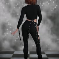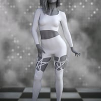 It includes a strappy crop top and a pair of strappy pentagram leggings, with 6 styles for each piece and several mix-and-match options, rendered in Iray.