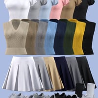 This product is a preppy style knit vest outfit. It consists of a vest, t-shirt, skirt, and sneakers. Thank you.