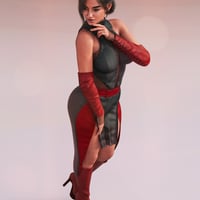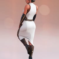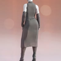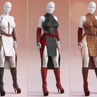 "dForce M8 Void Siren Dress for Genesis 9" is a statement piece for women unafraid of bold forms and futuristic aesthetics. A modern cut with a high collar, daring neckline cut-out, and contrasting leather gloves creates a striking silhouette. A sleek metallic belt and asymmetrical skirt slit add dynamic edge. Perfect for evening events, photoshoots, or any moment you want to own the spotlight.