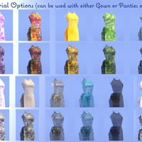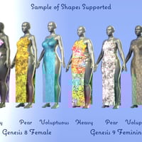 This outfit consists of a gown and panties for the Genesis 9 and Genesis 8 Female figure along with a selection of material, shader, and dForce presets. The Genesis 9 version is optimized to work with the Genesis 9 Base Feminine shape.