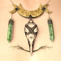 - The Woodland Witch Necklace has 3 moons, 2 crystals, and a crow skull. A swing forward morph can be deployed to keep the necklace from defying gravity.