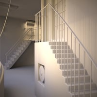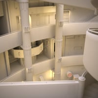 A central double-helix staircase (with separate up and down stairs) has radial bridges leading out to the RIM. Here you'll find offices and apartments (fully rigged with opening doors. The lit space behind can be hidden for your own extensions).