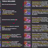 The autopose scripts come in four versions. The Basic version only poses the arm when a face is selected anywhere on the hand. The Complete versions can pose all or several of the arms areas you want including the arm and/or the hand and/or the first bone and/or the second bones of a finger, either ascending (from finger to collar) or descending (from collar to finger), as long as a face is selected on a fingertip. Finally, the Child version poses the arm so that the selected faces on an object parented to the hand reach the target.
