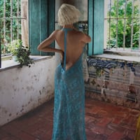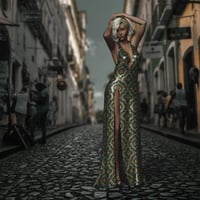 Introducing Falling Star, a sexy, slinky gown with a high slit in front and an amazingly sensual, low cut T-back.