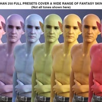 Need a red devil? A black demon? A green superhero? The Fantasy Skins for Genesis 8.1 Males set will provide you with all you need to make great fantasy creatures using any of your existing Genesis 8.1 Males and their original texture sets, providing more than two hundred presets, to begin with. Even better: based on a unique shader mixer shader, you can access even more skin configurations using four layer blending effects, each effect allowing you to choose more than 26 blending modes (amongst them hue and saturation), and using two additional effects on the translucency color. Play with these effects in the surfaces editor, or simply load the existing presets and tools, it’s up to you!