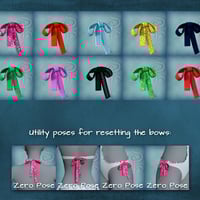 This set comes with ten texture options for swimsuit and flipflops. It also includes extra presets to change the texture on the bows only, so you can mix and match. In addition it includes four utility poses to quickly reset the pose of each bow individually.