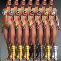 This classic fantasy armor for the Genesis 2 Female comes straight out of the artwork from Vallejo, Bell or Frazetta. This 3D set consists of a top, panties, bracers and greaves that come with gold, chrome, bronze, steel, red, blue and green texture options. Fits for Victoria 6, Gia, The Girl, Teen Josie and the Heroine morph by Predatron and Diane, premiere 3D models, are included. Also included is an axe prop for both left and right hands.