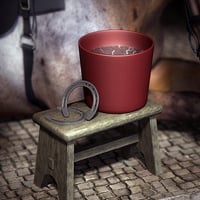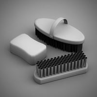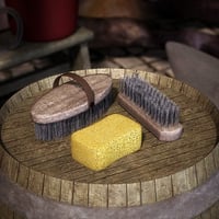 Put together a realistic horse grooming scene with horse grooming accessories such as a sponge with a "squeeze" morph, bucket, brush, and farrier tools including a horseshoe, anvil and hammer.