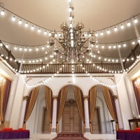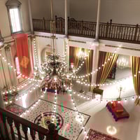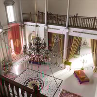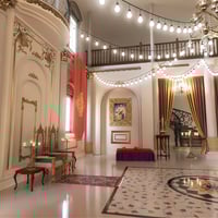 Includes chandeliers, string lights, curtains, thrones, side sofas and carpet props