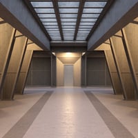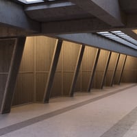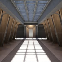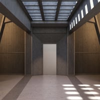 Kaaos - A corridor-type room which features open blocked ceilings that allow sunlight to filter through, creating a dynamic interplay of light and shadow within the space. Constructed primarily of concrete, the building showcases intricate angled walls that not only contribute to its aesthetic appeal but also enhance structural integrity. Sliding doors within the room facilitate smooth transitions between differing areas. The design emphasizes both functionality and architectural interest, making the room feel expansive and inviting.