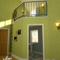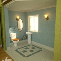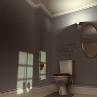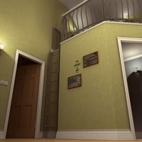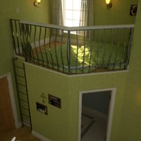This cute little elevated 3D chill-out room us accessible via a ladder and includes a small cupboard enclosed fully-rigged bathroom with a vanity mirror and decorative vase.