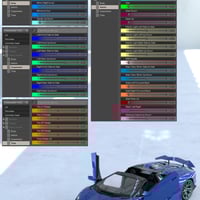 The vehicle has 276 material zones that are all organized in to 13 groups. The 3Delight version of the car uses the Uber Surface shader that comes with Daz Studio and the Iray version of the car uses both the Daz Uber Iray shader and some of the Nvidia MDL shaders that come with Daz Studio.