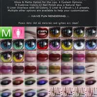 Included with Lucille are 2 sets of Custom Nails including a Claw with lots of colors to choose from, 1 set of Vampire's teeth, 4 different Eyelash trans maps with Custom Lash Morph. 12 makeups, 5 Eyeliner & 2 Blush L.I.E Options, 5 Eyeliner Overlays with 10 color choices, 14 Eye colors & 12 Lip colors that come with the option of switching to either Gloss & Matte shader. Check out the 'What's Included and Features' list for full details.