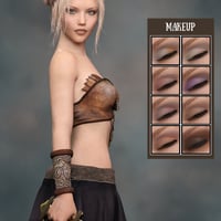 Options include eight eye colors plus, eight makeups/lipsticks. As always, there are nine presets that include makeup, and nails for an easy all-in-one solution. Buttons for Tattoos on/off, Anatomical Elements and a No Brow face texture option are included. All the textures use the Genesis 3 Female UV.