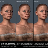She has a wonderful dirty, Battle Damaged skin with loads of options. She can be just dirty or clean with cuts and bruises or fresh from battle dirty and cut.