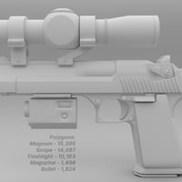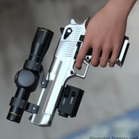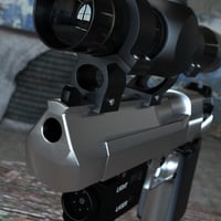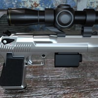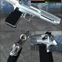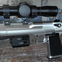 This model is designed with real-world movement in mind. The trigger, Hammer, Safety Switch, and Slide can be moved independently of one another for animation using the pose controls. The scope and flashlight have no moving parts. There are 2 material settings for the Eagle 44, Silver and Dark Grey. Each is available for 3Delight and Iray.