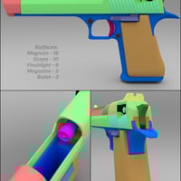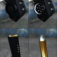 There is a separate bullet that loads into the barrel of the gun and parented to the Eagle. There is also a separate bullet that will load at the center of the scene not parented to the gun and the magazine can be emptied or loaded with 8 rounds, one bullet prop, and 7 instances of that prop. All the props load parented to the Eagle 44 accept the single bullet that loads at the scene center. The flashlight has on/off presets for Iray. The laser does not emit light.