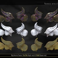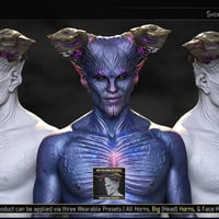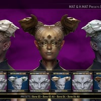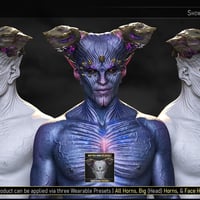Big Horn Props & Socket Morph | A wearable preset will load a pair of highly detailed head horns alongside an HD socket morph that ensures their proper placement. The Props are static followers that can be toggled on and off easily. This pack also provides seven different looks, each with at least one variation, for a total of 19 Horn Hierarchical Material Presets and two Shaping Presets (to toggle the sockets on and off).