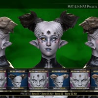 Face Horn HD Morphs & Face Fx Geoshell Wearable | The Face Horns consist of two partial HD Morphs (Brows and Cheeks), which are loaded with a Geoshell to apply their textures with a subtle transition for a non-destructive and flexible workflow. Similar to the Big Horns, we offer seven matching looks, along with variations, for a total of 22 MAT Presets. Three of these presets offer alternative cutout masks to use the horns partially, providing even more variation. Four Shaping Presets are supplied to dial in and out the Brows and Cheeks HD Morphs.