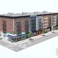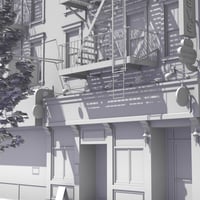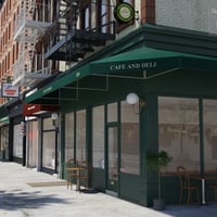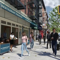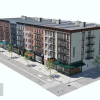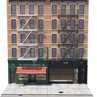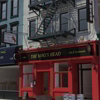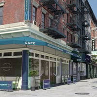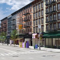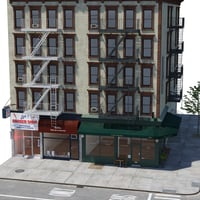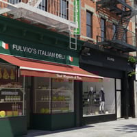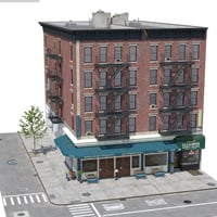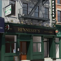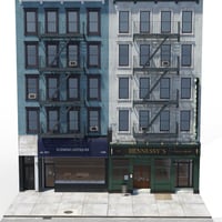 A set of buildings inspired by the stores of New York featuring a restaurant, a pub, an Irish pub, a cafe, a barber shop and various stores.