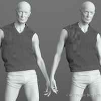 With a custom head, body, Adam's Apple, eyes, teeth, nipples, navel, HD sculpt, and more, he's a definite step away from the default figure. His figure is rangy, with knobby knees and prominent elbows. Because of his very flat chest, there is also a projection morph available if there are undesirable creases in clothing around that area. It is “off” by default and can be found easily in his character folder if a fix is needed.