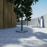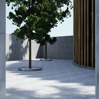 Surrounding the pavilion is an open courtyard filled with trees, providing a natural contrast to the modernist architecture.