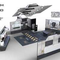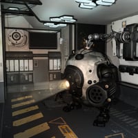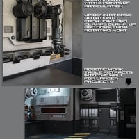 The Research Lab is composed of props to give you just the angle you need for the shot you want. Walls can be hidden, moved or re-configured to fit your needs. Cabinets along the back wall and the rear door open with dials. The robotic arm is very adjustable like the room and has a retractable table so you can work on larger projects. The lab also comes with 17 lab props to place around the lab for greater realism.