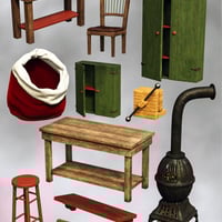 Included in Santa's Toy Workshop is a collection of sturdy wooden furniture, including a tall cabinet, workbenches, stools, a smaller hanging cabinet, a table, a hanging shelf, a big sturdy chair, and a coat rack. A large pot-bellied stove with firewood and glowing coals can be placed anywhere in the room, and the included lights cast a warm glow upon the walls. Finally, a deep red twisted rug completes the scene, ready to move in.
