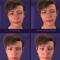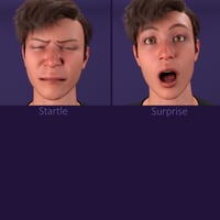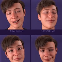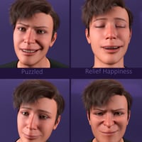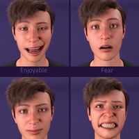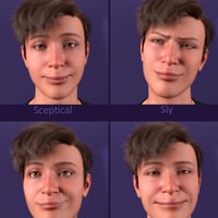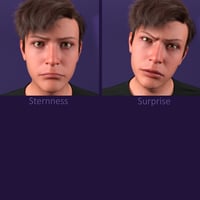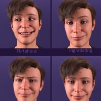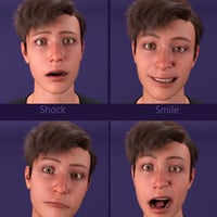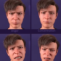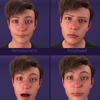 This collection of 60 different expressions and pose presets shows the finest gradations between all variants of a smile, anger, sadness, surprise, and fear.