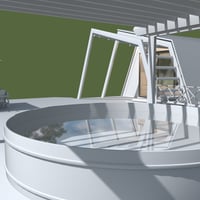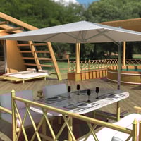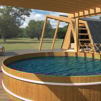 This delightful 3D environment features a charming cabin complete with a snug bed indoors, an inviting wooden deck with a serene pool under a pergola, and a whimsical outdoor dining area shaded by a large umbrella.
