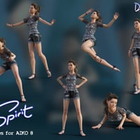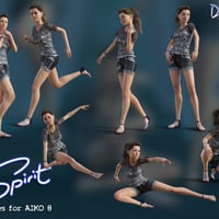 Spirit Poses for Aiko 8 have been carefully designed for a realistic, natural look. All poses will look good from different camera views including close up. There are 20 poses plus a reset pose. There's a combination of elegant model style poses, dynamic movement and everyday poses perfect for your 3d art projects. Some poses will work better with Limits turned off.