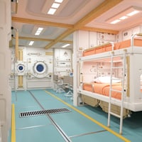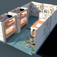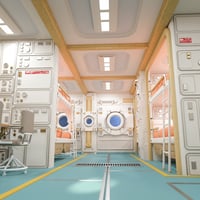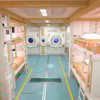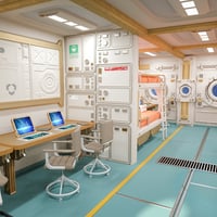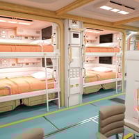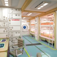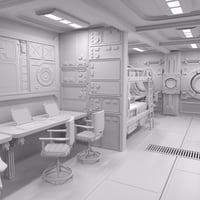 It includes a sci-fi student dorm interior scene, HUD screens, beds, desks, and tables in the scene. All are ready to render in Iray.