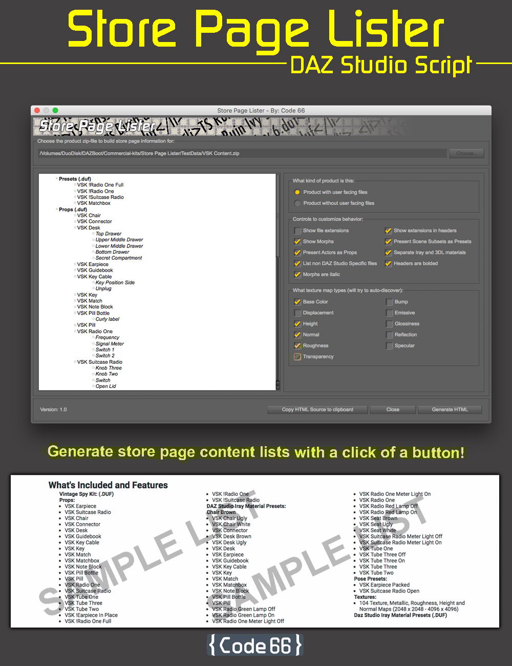 Store Page Lister is a Daz Studio script to help PAs to quickly and easily correct or create store page lists for the "What's Included and Features" section of a product page.