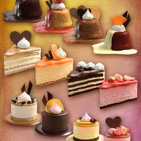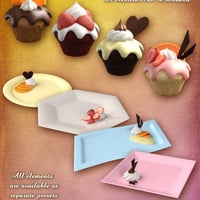 With this pack you get a small cake with sauce, a slice of cake with topping, a mouse with sauce and topping and a muffin with icing, and four different plates.