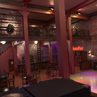 The iconic fireman's pole is still in place, leading to a small stage perfect for dancers or musicians. A dressing room above the pole gives the dancers a place to enter the stage from.