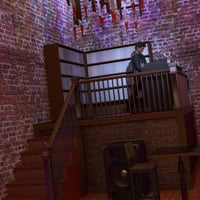 Finally, original pieces, such as the ladder/wine rack, and the ladder sculpture over the fully modeled DJ Booth, and an artpiece containing antique firefighters equipment add to the theme of this nightclub.